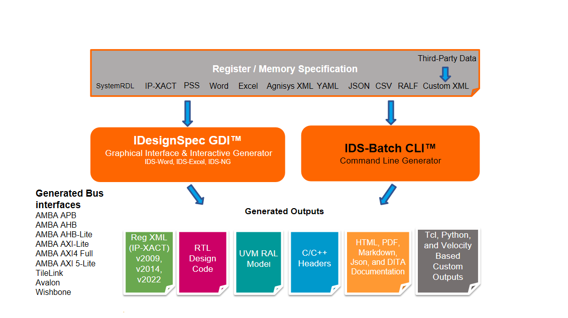 Streamline your project with automatic generation of RTL, UVM Register Layer, UVM Model, UVM Testbench for IP SOC Verification, System level SoC Validation, and IP Integration. Our suite automates file generation, benefiting designers, verification engineers, embedded programmers, pre-silicon validation engineers, and post-silicon lab teams. All files, including the programmer’s manual documentation, are automatically generated, replacing manual coding and updates. Accelerate project schedules and optimize human resources with our comprehensive solution.