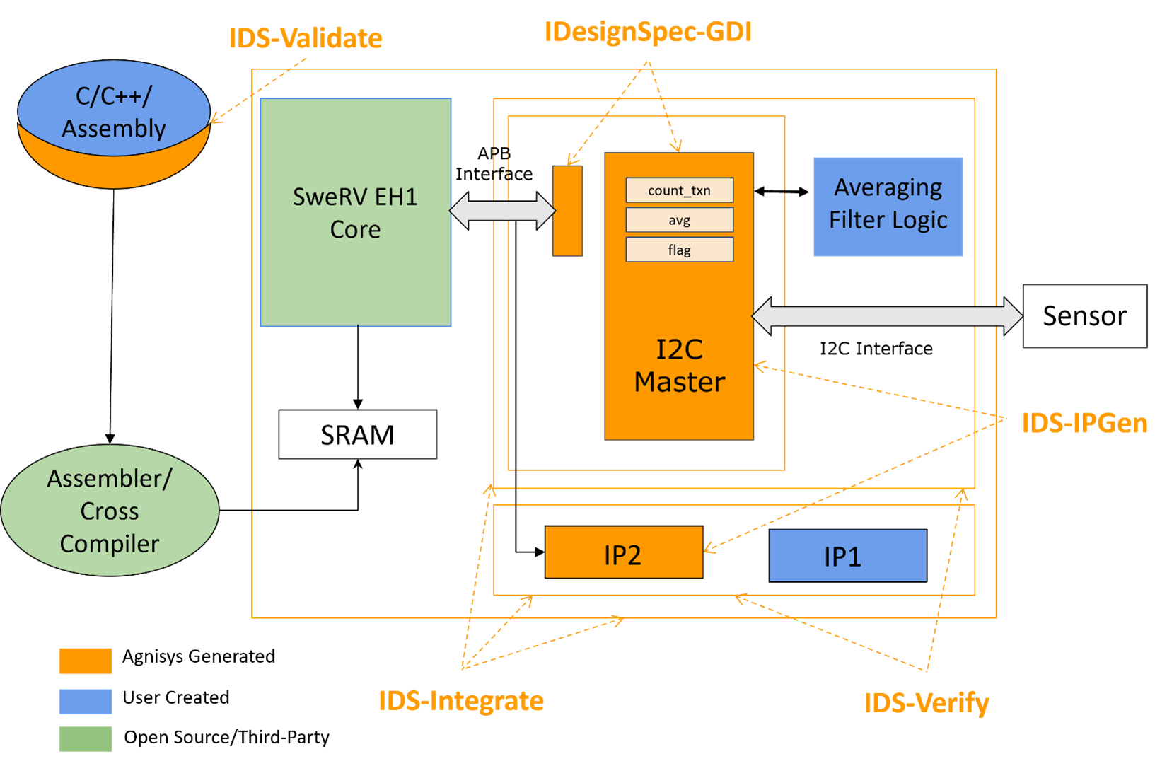To demonstrate the value of our flow, we created our own small SoC design. It averages sensor data received over an I2C interface. Sensor values are read in and converted into an averaged value by user application logic, all under control of software running on a CPU. The diagram below shows the design and where our tools were used in the flow. The CPU is the open-source SweRV Core EH1, a 32-bit, 2-way superscalar, 9-stage pipeline implementation of the RISC-V architecture. Other than this core and the averaging RTL and software, the entire project was automated using our unified flow: